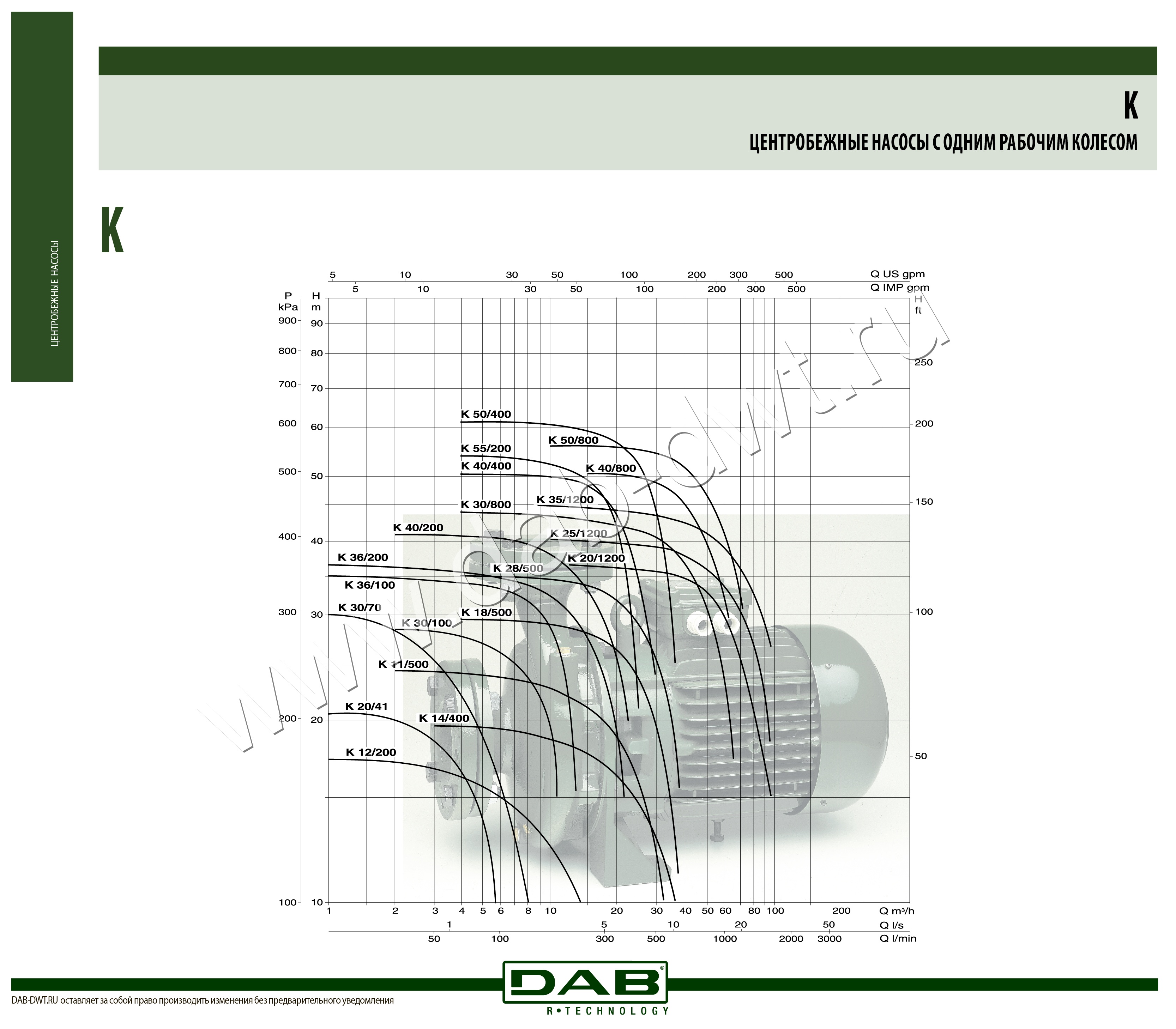 Dab DAB K 14/400 T обладает асинхронным двигателем закрытого типа с внешним воздушным охлаждением. В шарикоподшипниках вращается вал двигателя. Смазка ему не нужна, а это означает минимум шума, но долгую службу двигателя. Чтобы не перегружать насос, в статор однофазной версии встроили тепловую защиту. Из особенностей, можно выделить, что двигатели однофазных моделей оборудованы встроенным тепловым выключателем.